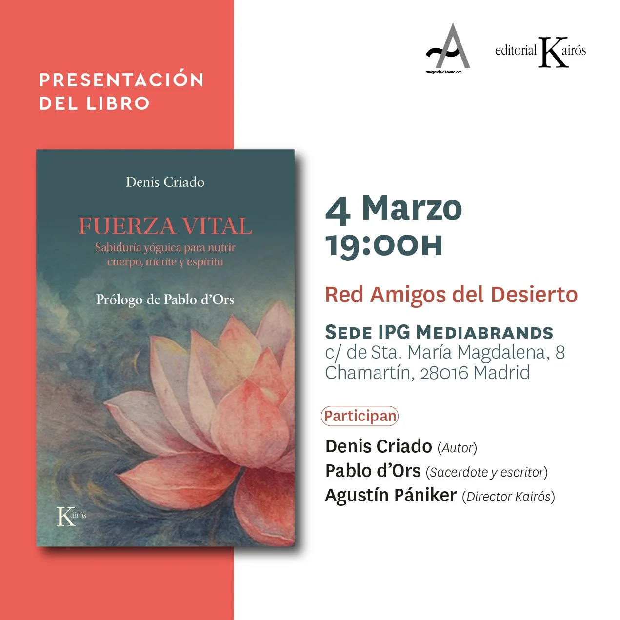 Editorial Kairós y Red Amigos del Desierto os invitan a la presentación de Fuerza vital, con el autor Denis Criado y presentado por Pablo d’Ors, sacerdote y escritor y Agustín Pániker, director de editorial Kairós.